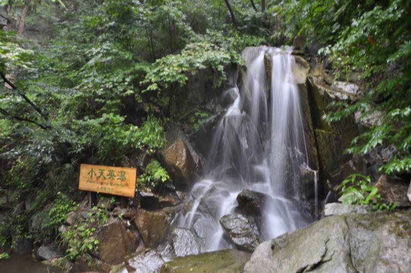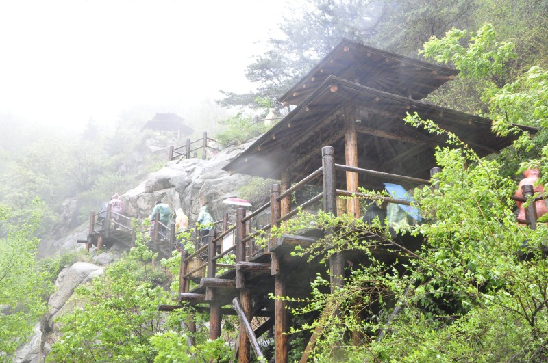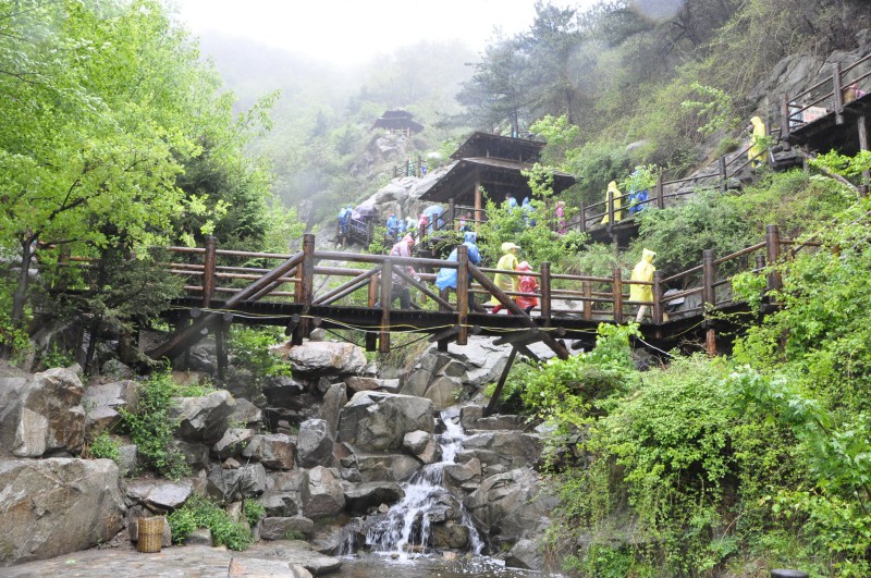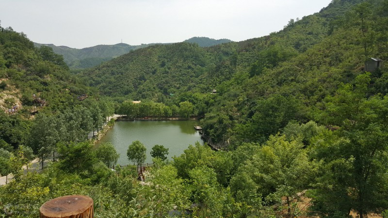 瀑布群的上方是“天池”,過了這汪碧水之后可繼續沿著棧道攀登直達山頂。景區的高處是一座觀景臺,在這里可以環望四周群山,風光無限。下山并非原路,但依舊是木棧道,途中有幾處比較陡峭,要注意安全。下山棧道的終點即是上山入口,可選擇坐觀光車回景區大門。