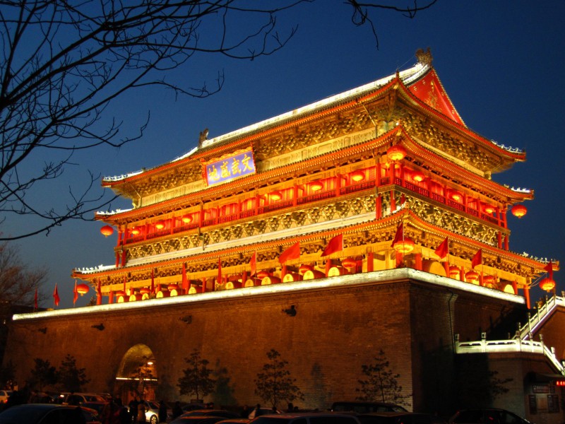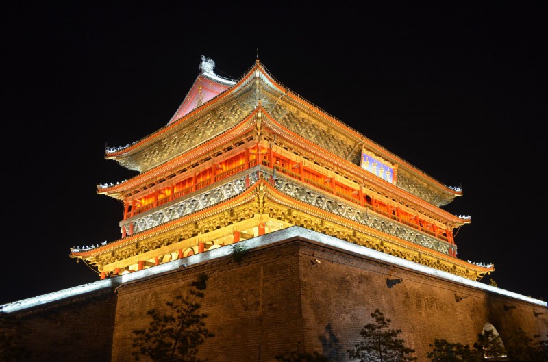 西安鼓樓是全國大的鼓樓,底部是高大的長方形臺基,臺基辟有高和寬均為6米的南北向門洞。臺基上的樓分上、下二層,頂覆綠色琉璃瓦。