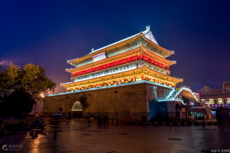 在鼓樓和鐘樓之間為鐘鼓樓廣場,綠草紅花點綴其間,有造型獨特的音樂噴泉,這里的夜景很美,適合拍照。鼓樓后邊就是擁有眾多美食的回民街。