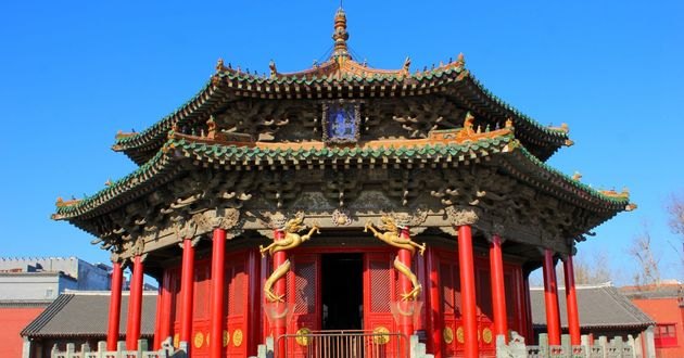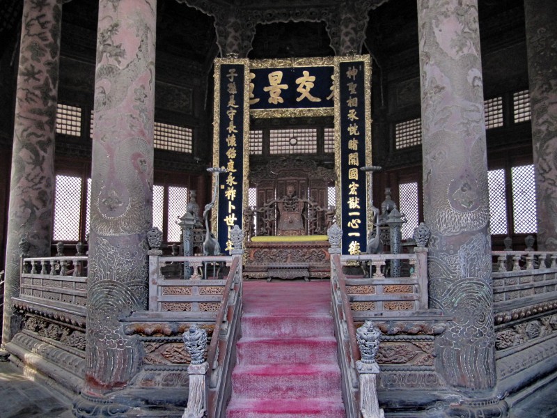 大政殿俗稱“八角殿”,清入關前也稱“大殿”或“篤恭殿”,是清太祖努爾哈赤營建的重要宮殿,也是東路的主要建筑。清入關前,這里是舉行皇帝登基、元旦、萬壽節朝賀、筵宴典禮等重要慶典的地方,平時則用以舉行議政王大臣會議或頒布重要詔令等。殿內陳設有金龍寶座、金漆屏風、嵌琺瑯象馱瓶等珍貴文物,和康、乾、嘉、道東巡盛京時留下的墨跡,再現了當年大政殿的原貌。