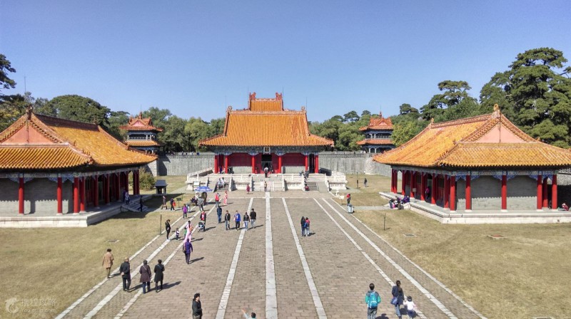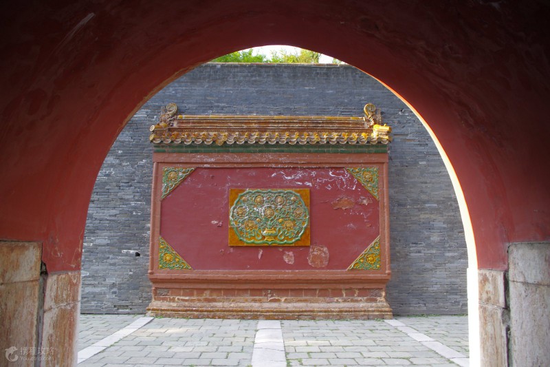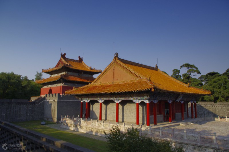 方城的北面就是月牙形的寶城,寶城前壁的正中有一座琉璃照壁。寶城的正中是寶頂,系用三合土筑成,下面的地宮埋葬著清太祖努爾哈赤和孝慈皇后葉赫那拉氏。由于整個(gè)陵墓依山勢(shì)而建,你會(huì)發(fā)現(xiàn)建筑物也隨著坡勢(shì)起伏,顯得更加錯(cuò)落有致、高大雄偉。