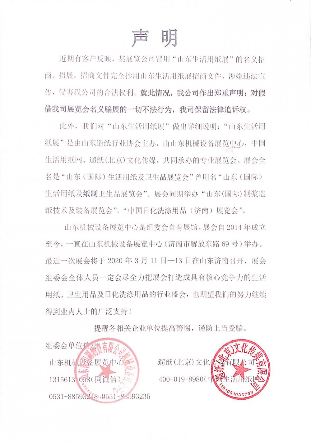 遛紙生活用紙展聯(lián)合聲明:近期有客戶反映,某展覽公司冒用“山東生活用紙展”的名義招商招展,招商文件完全模仿山東生活用紙展招商文件,涉嫌違法宣傳,侵害我司的合法權(quán)利。就此情況,我司做出鄭重聲明:對(duì)假借我司展覽會(huì)名義騙展的一切不法行為,我司保留法律追訴權(quán) 。提醒相關(guān)企業(yè)單位,提高警惕,謹(jǐn)防上當(dāng)受騙!2019第十七屆*遛紙中國(guó)(沈陽(yáng))生活用紙及衛(wèi)生用品展將于2019年9月20-22日沈陽(yáng)國(guó)際展覽中心W3館召開(kāi),歡迎各界人士指導(dǎo)洽談!