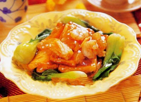 配 料:豆腐、蝦仁、海參、魷魚、小油菜、蠔油、雞精、蔥、姜、鹽、糖、高湯、食用油